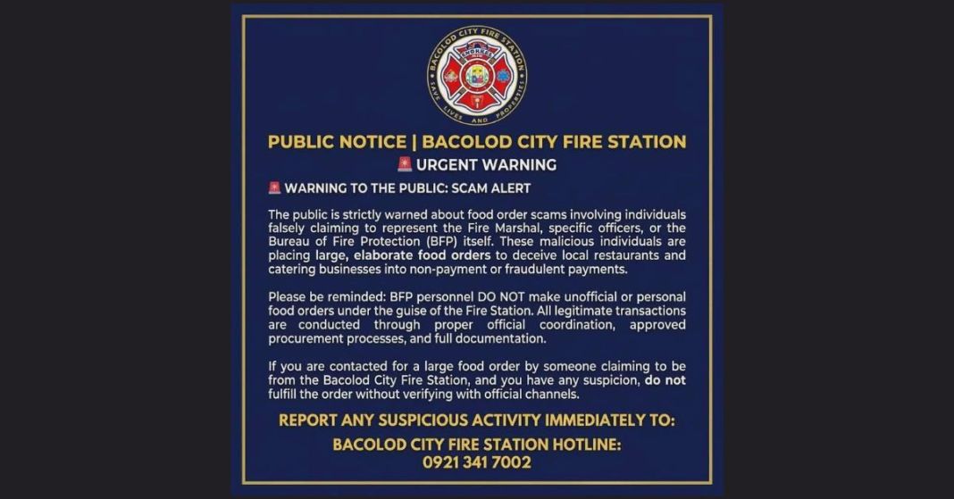 BACOLOD CITY — The Bureau of Fire Protection in Bacolod City and Negros Occidental has warned business establishments and the public against food order scams involving individuals falsely claiming to represent the BFP.