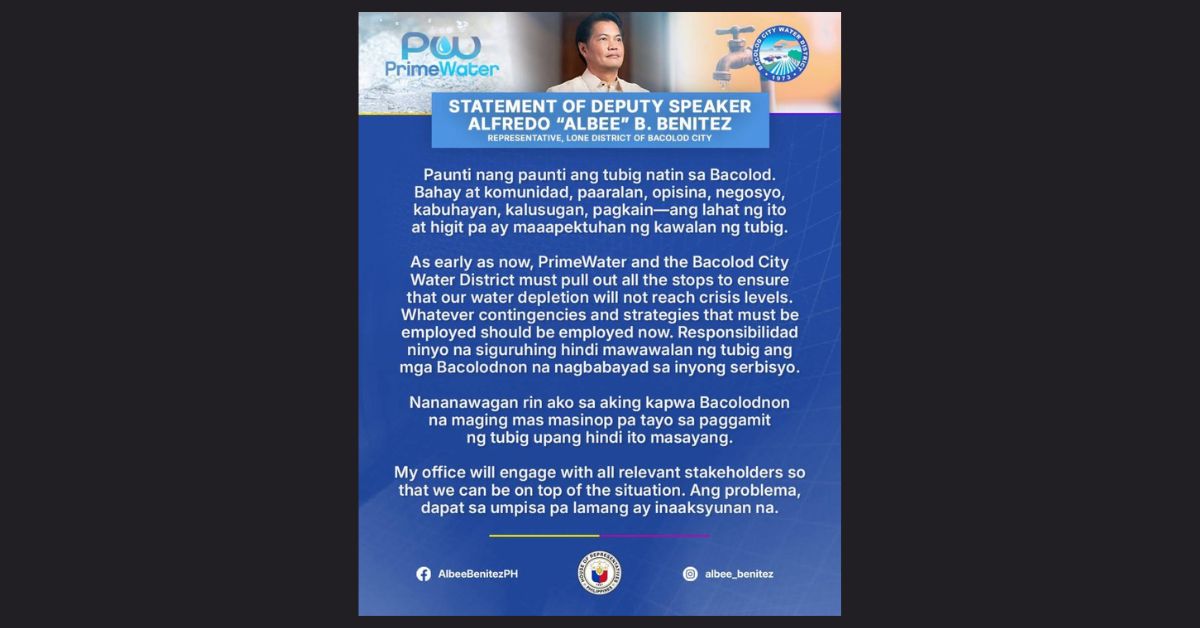 BACOLOD CITY — Bacolod Rep. Alfredo “Albee” Benitez has urged Baciwa-PrimeWater to take all necessary steps now to prevent the city’s worsening water depletion from reaching crisis levels.