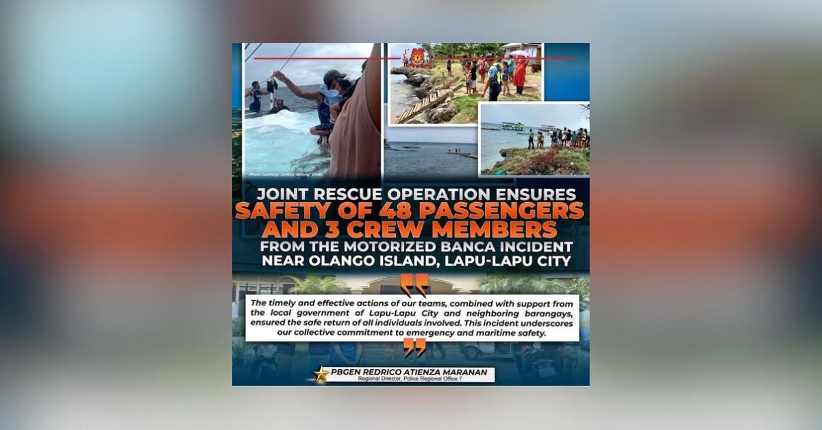 Luwas ang 48 ka pasahero ug 3 ka tripulante sa usa ka motor bangka human kini nakasinati og problema sa makina sa taliwala sa dagat duol sa Barangay Sabang, Olango Island, Lapu-Lapu City, Martes, Pebrero 25, 2025.