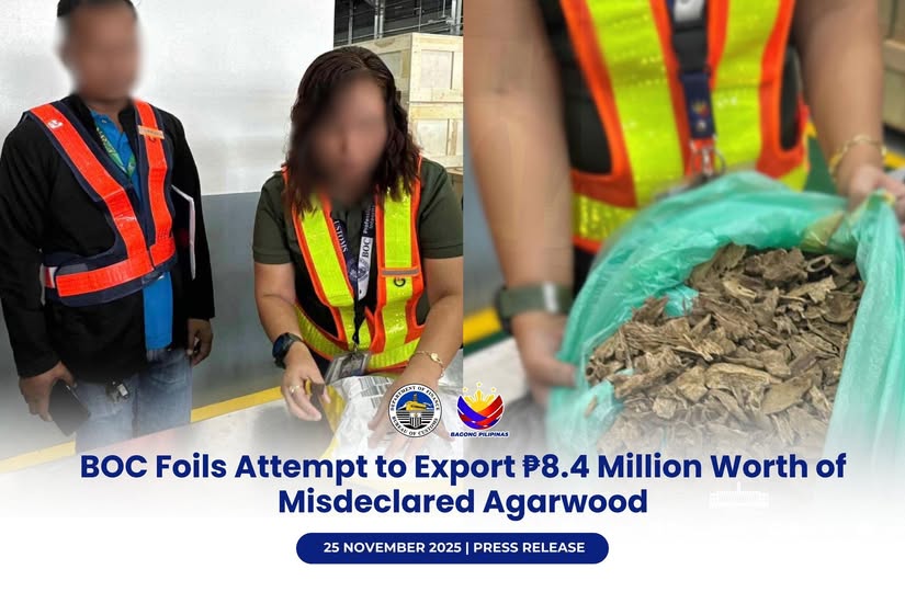 Malampuson nga napugngan sa Bureau of Customs (BOC) ang pagluwas sa tibuok 11.21 kilos nga misdeclared agarwood nga nagkantidad ug ₱8,407,500 human kini masakmit sa usa ka warehouse facility sa Lapu-Lapu City niadtong Nobyembre 21, 2025.