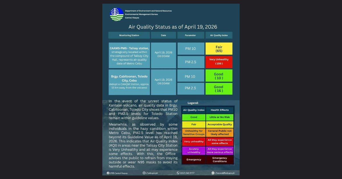 Nagpahimangno ang Department of Environment and Natural Resources – Environmental Management Bureau (EMB) Central Visayas nga misaka sa “very unhealthy” nga lebel ang kalidad sa hangin sa pipila ka bahin sa Metro Cebu hangtod alas-8:00 sa buntag kagahapon Abril 19, 2026.
