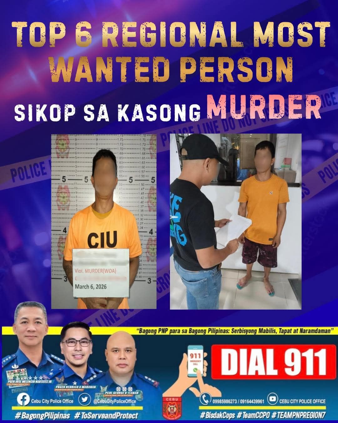 Sa alas 7:00 sa gabii sa Marso 6, 2026, ang mga kapulisan gikan sa City Intelligence Unit (CIU), Cebu City Police Office (CCPO) ubos sa pagdumala ni PCOL GEORGE VILLARTA YLANAN, Officer in Charge, nga gipangulohan ni PCPT CHRISTOPHER IRWIN SANCHEZ JR, ubos sa direktang superbisyon ni PLTCOL JERROLD JAKE MANGUERRA, Chief, CIU, malampusong nakaserbisyo og Warrant of Arrest sa Brgy. Tisa, Cebu City.