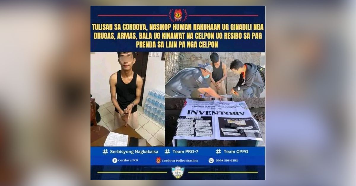 Ang suspetsado giila sa Cordova Police Station na mao si Jay-R Lopez alyas “Onom”, 23 anyos, walay trabaho, residenti rapud sa maong lugar.