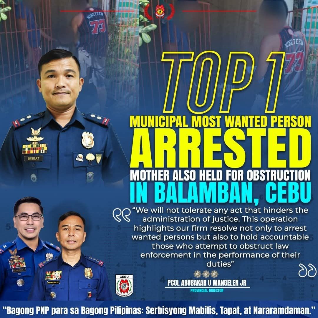 Nadakpan sa kapulisan ang Top 1 Most Wanted Person sa lebel sa munisipyo atol sa operasyon niadtong miaging adlaw sa Barangay Cambuhawe, Balamban, Cebu. Apil usab nga gidakop ang inahan sa suspek human kini giingong misamok ug mibabag sa legal nga pagdakop sa iyang anak.
