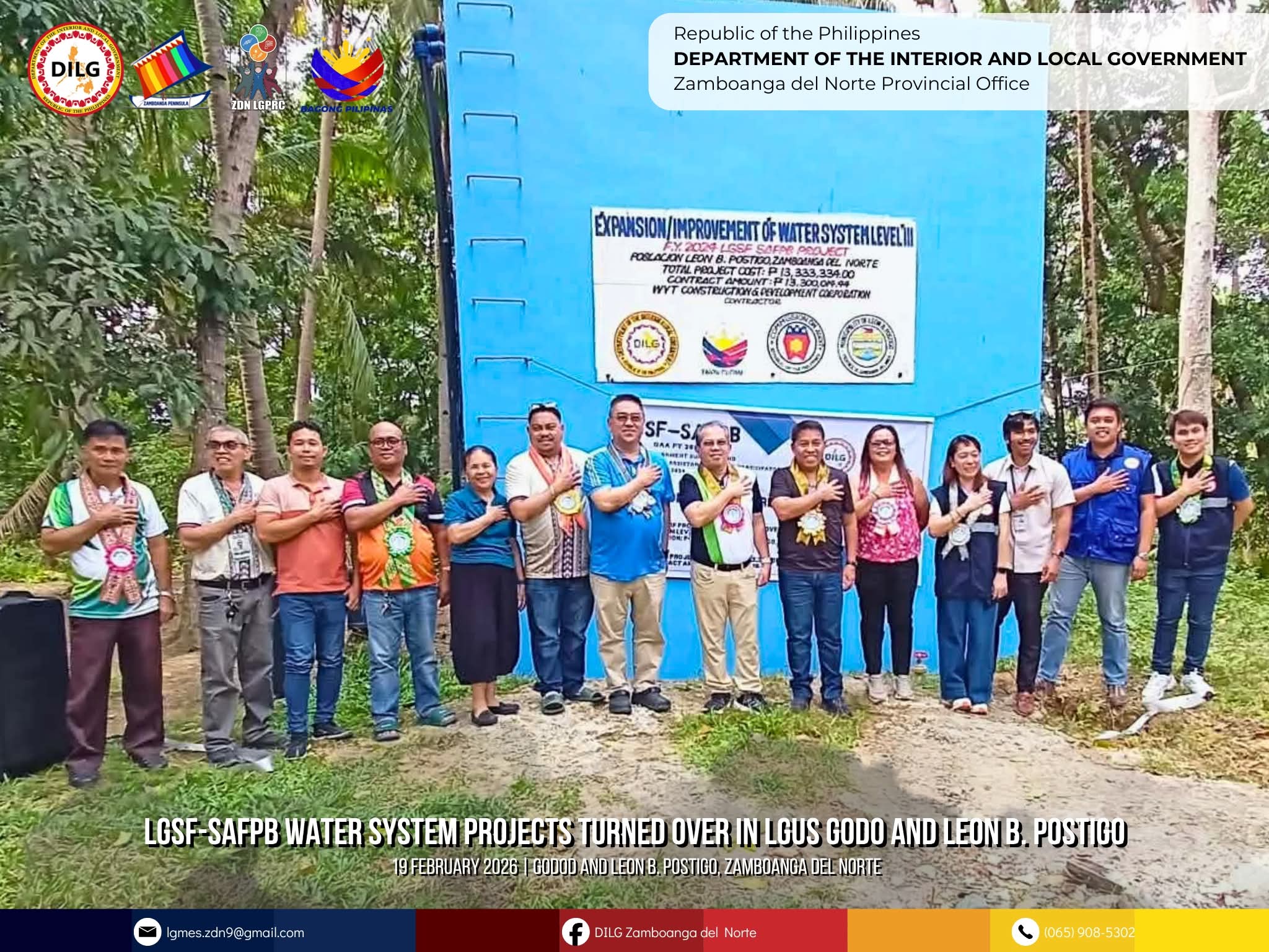ZAMBOANGA DEL NORTE — Malampusong nahuman ug opisyal nang giturn-over ang duha (2) ka Level III Water Supply System projects ubos sa Local Government Support Fund – Support and Assistance Fund for Participatory Budgeting (LGSF-SAFPB) FY 2024, nga nagpalig-on sa access sa limpyo, kasaligan, ug sustenableng suplay sa tubig sa probinsya.