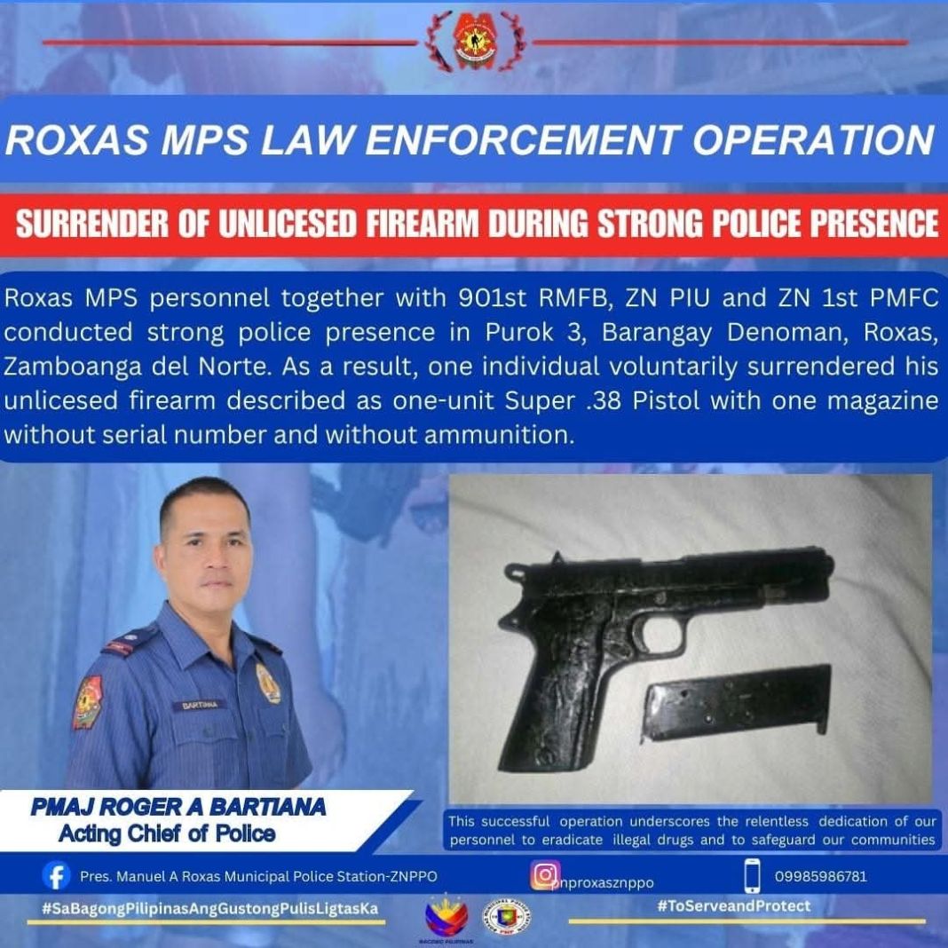Sa gipahugtan nga kampanya batok unlicensed fire-arms ug sa kusog nga presinsya sa kapulisan,usa ka malampusong joint operation ang miresulta sa pagkakumpiska sa dili lisensyadong armas nga boluntaryong gi-surrender sa usa ka indibidwal, didto sa Purok 3, Barangay Denoman, Roxas, Zamboanga del Norte, Septiyembre 7,2025.