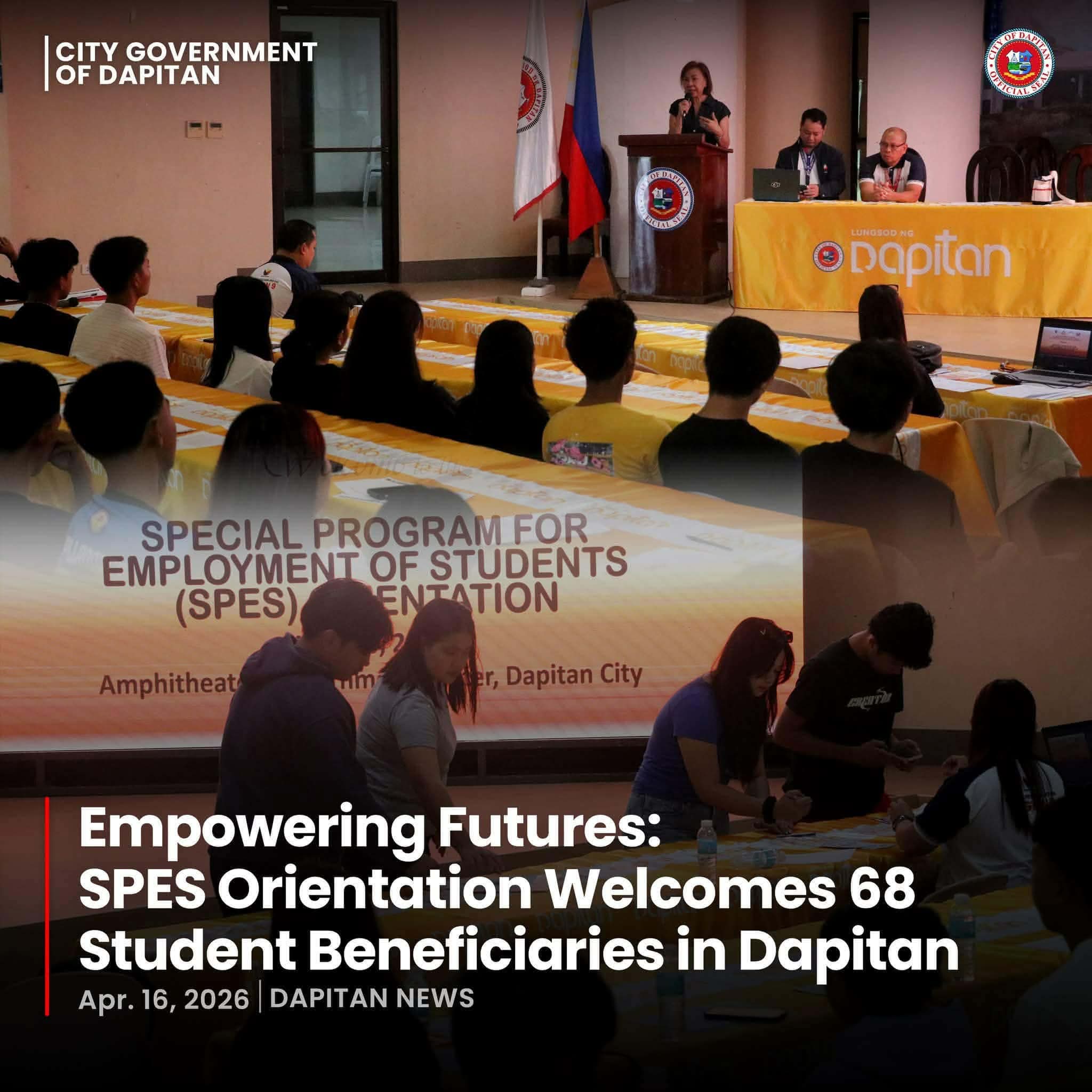 Aduna nay 68 ka estudyante sa Dapitan ang nakabenepisyo sa Special Program for Employment of Students (SPES) human nagtapok alang sa orientation sa unang batch niadtong Abril 16, 2026 sa Amphitheater sa Government Center, isip pagsugod sa ilang partisipasyon sa 20 ka adlaw nga employment program.