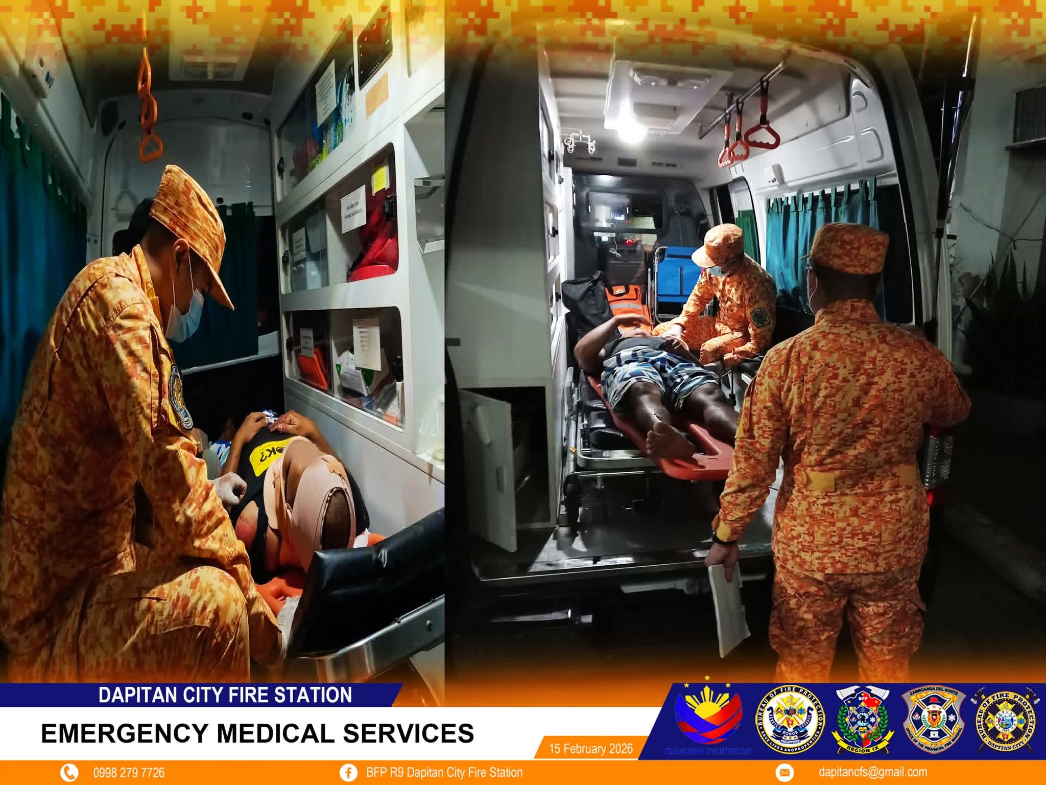 Human sukdon ug rekordon ang vital signs ug temperatura, gidala ang pasyente sa Zanorte Medical Center alang sa dugang pagtambal. Nagpabiling andam ang Dapitan City Fire Station sa paghatag og paspas ug episyenteng serbisyo sa matag emerhensiya sa syudad.(JENIFFER JR. DELICA)