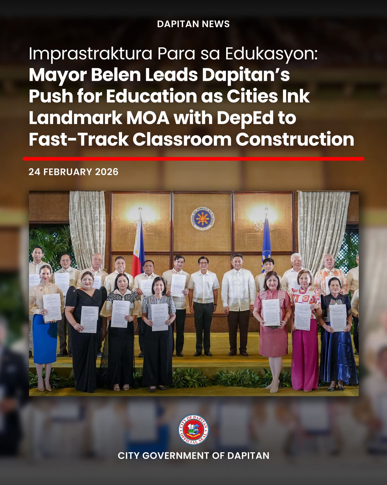 Mas mapadali na ang pagtukod sa mga classroom sa Dapitan City human mipirma si Mayor Evelyn “Belen” T. Uy sa usa ka Memorandum of Agreement (MOA) uban sa Department of Education nga nagtugot sa mas episyenteng implementasyon sa school building projects.