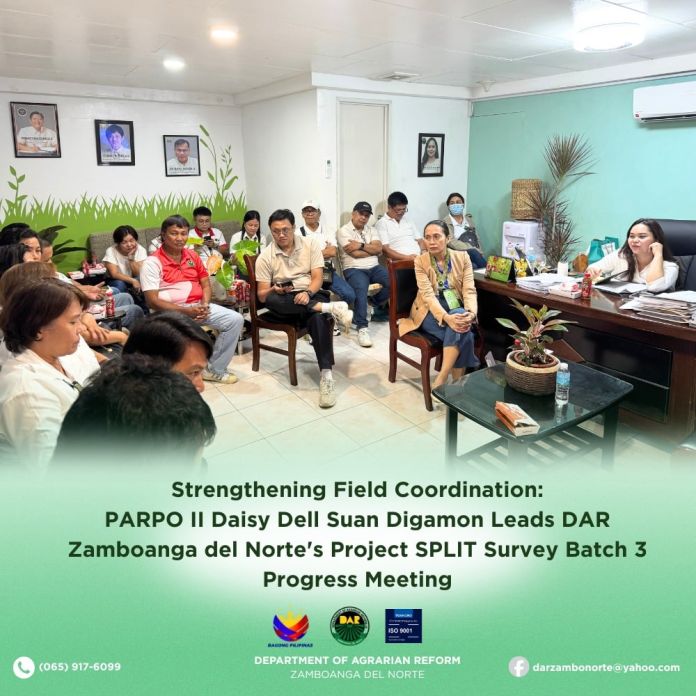 Sa padayon nga paningkamot sa Department of Agrarian Reform (DAR) Zamboanga del Norte sa paghatag og tin-aw, limpyo, ug hapsay nga pagdumala sa yutang agraryo, gipangunahan ni PARPO II Daisy Dell Suan Digamon ang usa ka lig-on ug hinungdanong Project SPLIT Survey Batch 3 Progress Meeting, kaniadtong milabyng adlaw.