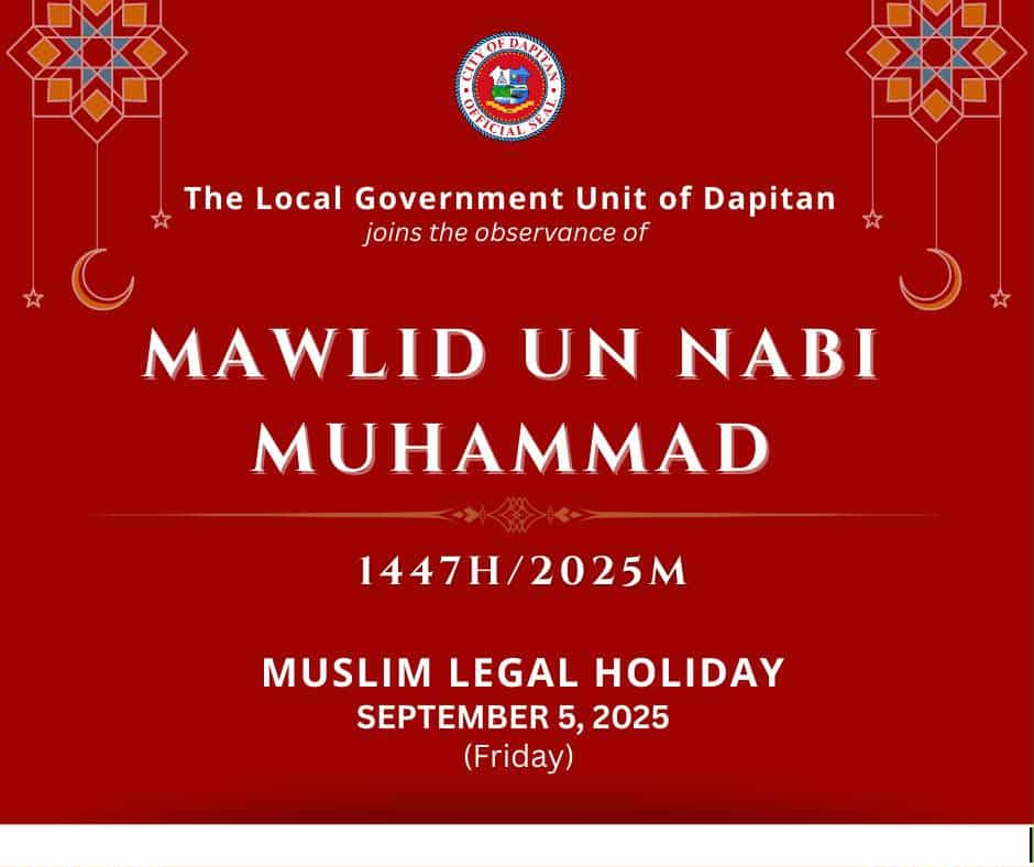 Mipagawas og Update ang Lokal nga Pangagamhanan sa dakbayan sa Dapitan, niadtong nakalabay’ng Setyembre 02, 2025, kabahin sa pag-obserbar sa Muslim Legal Holiday, diin masinatian sa mga Government Employee ning maong Probinsiya ang Long Weekend.