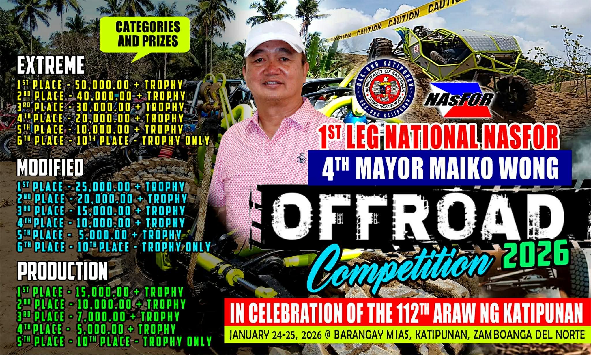 Mupasiugda og kusog ug kasikas ang lungsod sa Katipunan sa pagdumdum sa ika-112 nga Araw ng Katipunan pinaagi sa 1st Leg National NASFOR 4th Mayor Maiko Wong Offroad Competition 2026 nga ipahigayon sa Enero 24 hangtod 25 sa Barangay Mias.