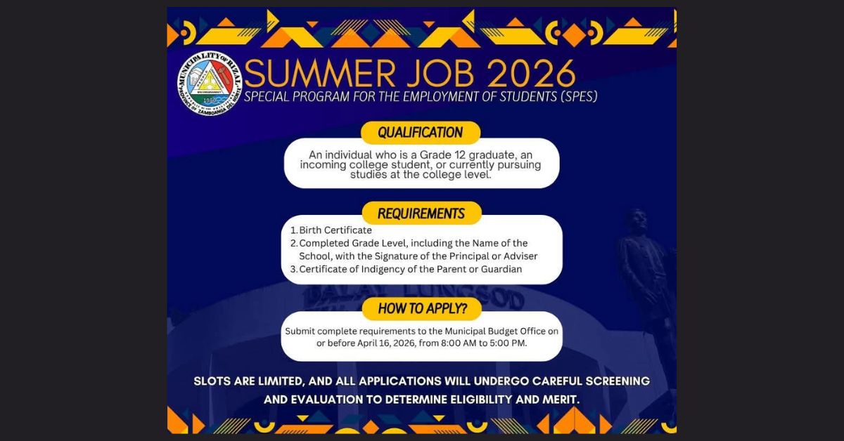 Sumala sa LGU Rizal, limitado ra ang slots alang sa summer job, busa giawhag ang mga kwalipikadong aplikante nga mo-submit dayon sa ilang requirements lakip ang birth certificate, complete grades, ug certificate of indigency hangtod Abril 16, 2026.