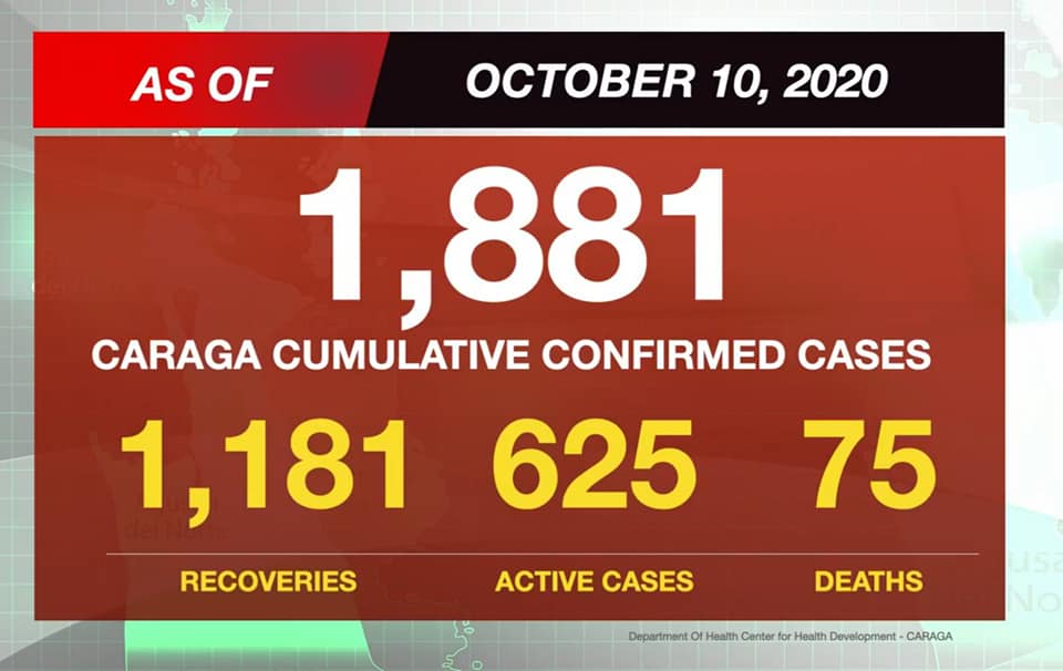 DOH Caraga Region Update As Of October 10, 2020By RPN - October 12, 2020024FacebookXWhatsAppViberLinkedinTelegramReddItLINE DOH Caraga Region Update as of October 10, 2020. (Data from Department of Health Center for Health Development – Caraga)Share this: Share on Facebook (Opens in new window) Facebook Share on X (Opens in new window) X