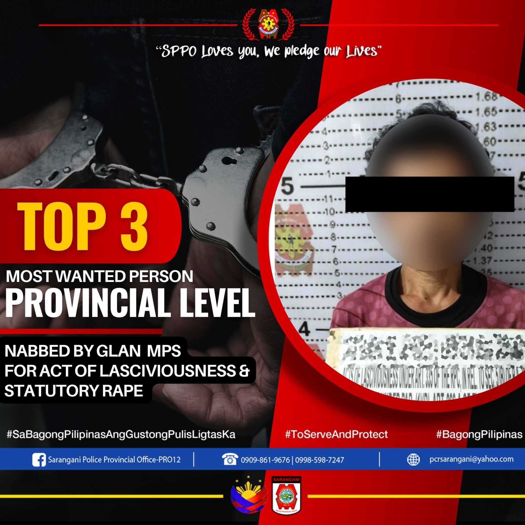General Santos City – Ang operasyon sa pagpatuman sa balaod nga gihimo sa hiniusang elemento sa Glan Municipal Police Station Tracker team, Sarangani 1st PMFC, Regional Intelligence Division 12, Regional Special Operation Group 12, Provincial Intelligence Unit, ug MARPSTA Sarangani miresulta sa malampuson nga pagkasikop sa Top 3 Most Wanted Person sa Sarangani sa Purok Kawayan, Barangay Rio Del Pilar, Glan, Sarangani Province niadtong Disyembre 10, 2024.
