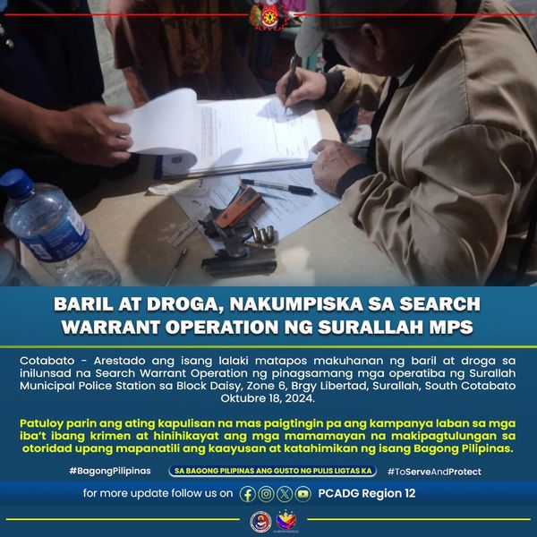 General Santos City – Arestado ang isa ka lalaki human kini nakuhaa’g druga ug pistola sa sa ginlunsad nga Search Warrant Operation sa mga hiniusang operatiba sa Surallah Municipal Police Station sa Block Daisy, Zone 6, Brgy Libertad, Surallah, South Cotabato, Oktubre 18, 2024.
