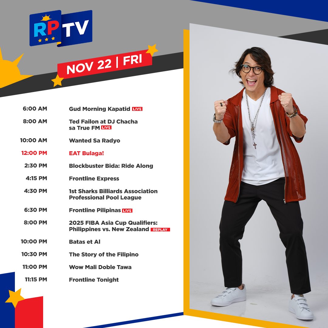 Happy FRI-YAY, Kapatid! FYI, kung ‘di mo napanood ang #GilasPilipinas versus Tall Blacks ng New Zealand kagabi, eh may chance kang mapanood ang replay at 8PM! Pero ngayong tanghalian, eh makipagkulitan muna tayo sa ating #LegitDabarkads ng #EATBULAGA at 12PM! All that and more, mapapanood dito lang sa #RPTV, Channel 9 sa Free TV at Channel 19.1 sa DTT! #ParaSaPinoy