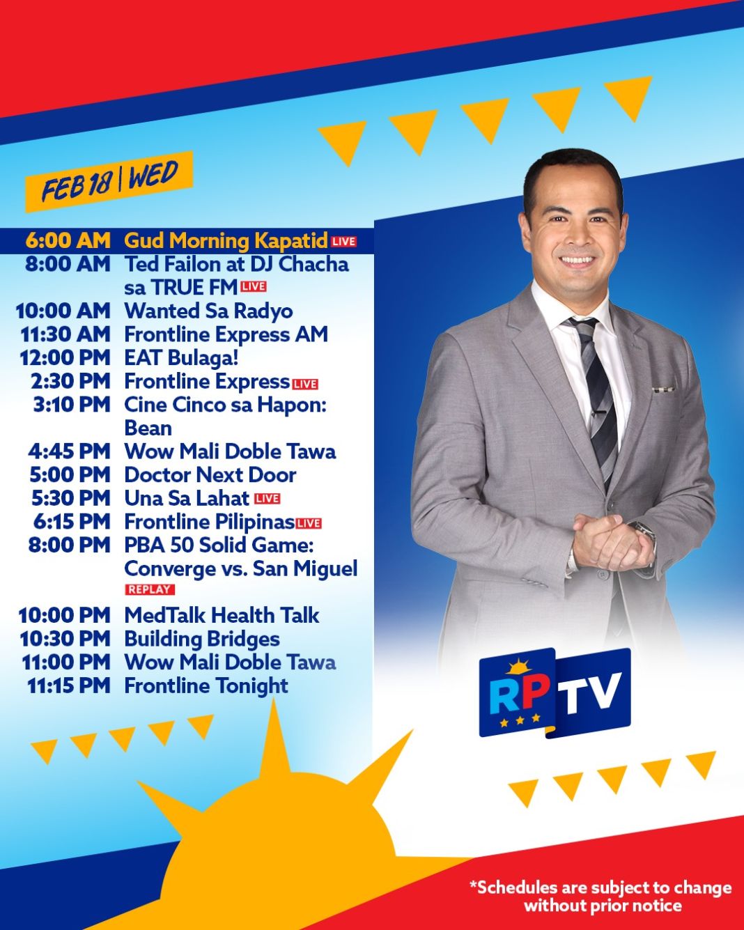 Happy Wednesday, Kapatid! Hump day feels? Wala tayo niyan sa ating tropahan! 😎😍 Sama-sama tayong mae-energize sa balitaan, kwentuhan, tips, chismis, tikiman, at pati na rin sayawan kasama si Andrei Felix at ang masayang barkada ng #GüdMorningKapatid, simula 6AM! But wait, there’s more, dahil sabay-sabay din nating babalikan ang ilang intense games 🏀🔥😳 mula sa #PBA50 Philippine Cup, with PBA Solid Game at 8PM tonight! Buong araw ⛅ hanggang hatinggabi 🌙, solid ang ating samahan! Walang magpapaiwan—hilahin na ang inyong mag-anak, kaibigan, at buong barangay sa panonood ng #RPTV, Channel 9 sa Free TV at Channel 18.2 at 19.1 sa DT