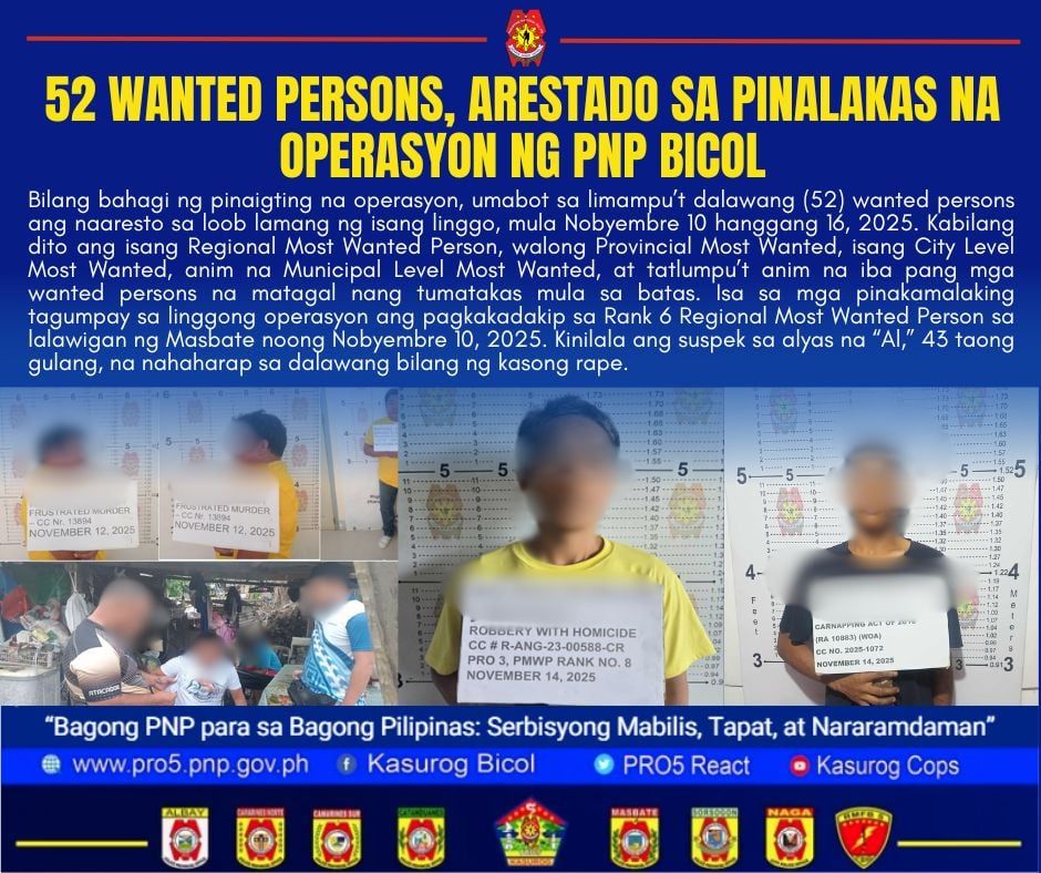 Bilang bahagi ng pinaigting na operasyon, umabot sa limampu’t dalawang (52) wanted persons ang naaresto sa loob lamang ng isang linggo, mula Nobyembre 10 hanggang 16, 2025. Kabilang dito ang isang Regional Most Wanted Person, walong Provincial Most Wanted, isang City Level Most Wanted, anim na Municipal Level Most Wanted, at tatlumpu’t anim na iba pang mga wanted persons na matagal nang tumatakas mula sa batas.