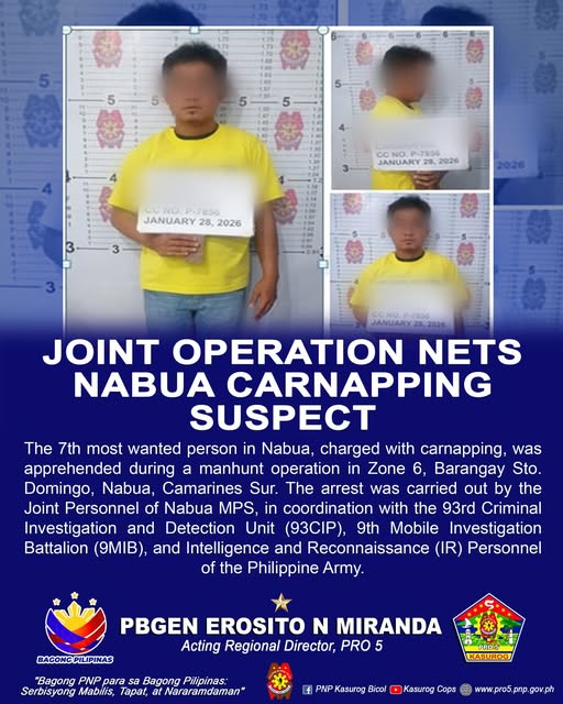 The 7th most wanted person in Nabua, charged with carnapping, was apprehended during a manhunt operation in Zone 6, Barangay Sto. Domingo, Nabua, Camarines Sur. The arrest was carried out by the Joint Personnel of Nabua MPS, in coordination with the 93rd Criminal Investigation and Detection Unit (93CIP), 9th Mobile Investigation Battalion (9MIB), and Intelligence and Reconnaissance (IR) Personnel of the Philippine Army.