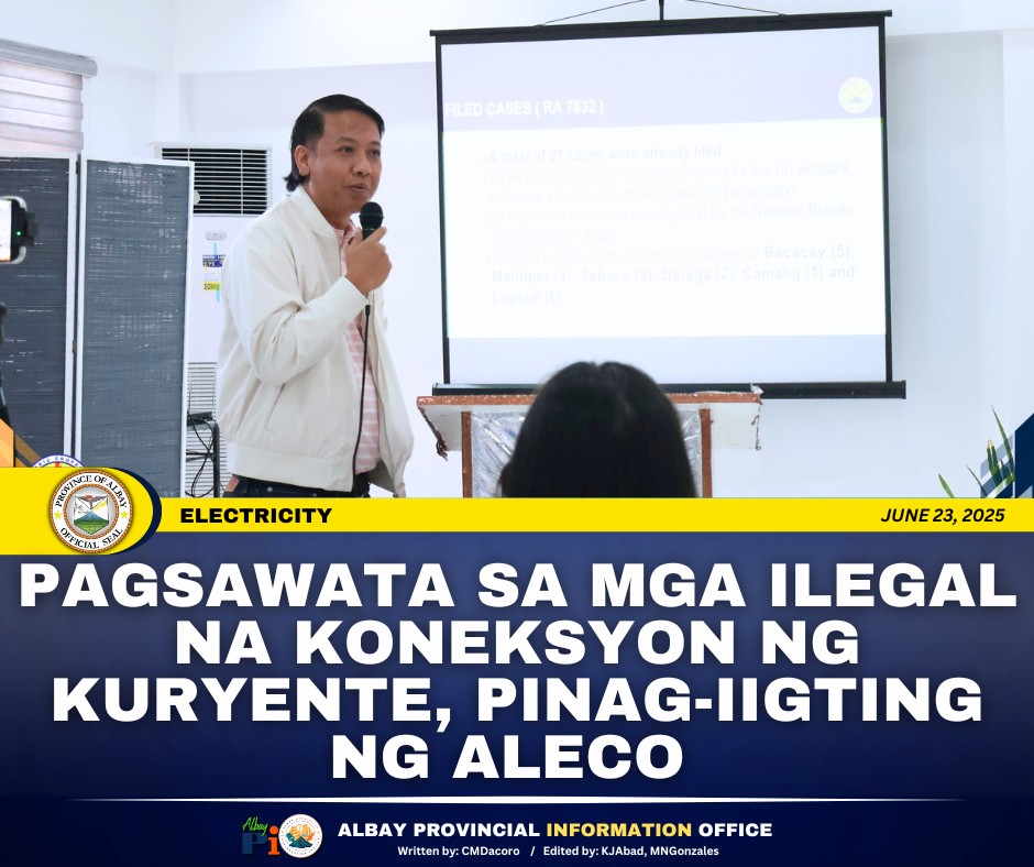 (Legazpi City, June 23, 2025) Pinag-iigting ngayon ng Albay Electric Cooperative Inc. (ALECO) ang kampanya para masawata ang ilegal na koneksyon ng kuryente sa lalawigan.