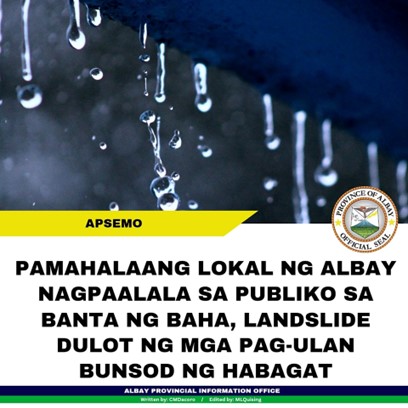 Mahigpit ang paalala ngayon ng Pamahalaang Lokal ng Albay sa publiko sa posibleng banta ng baha at landslide bunsod ng patuloy na nararanasang pag-ulan sa lalawigan.
