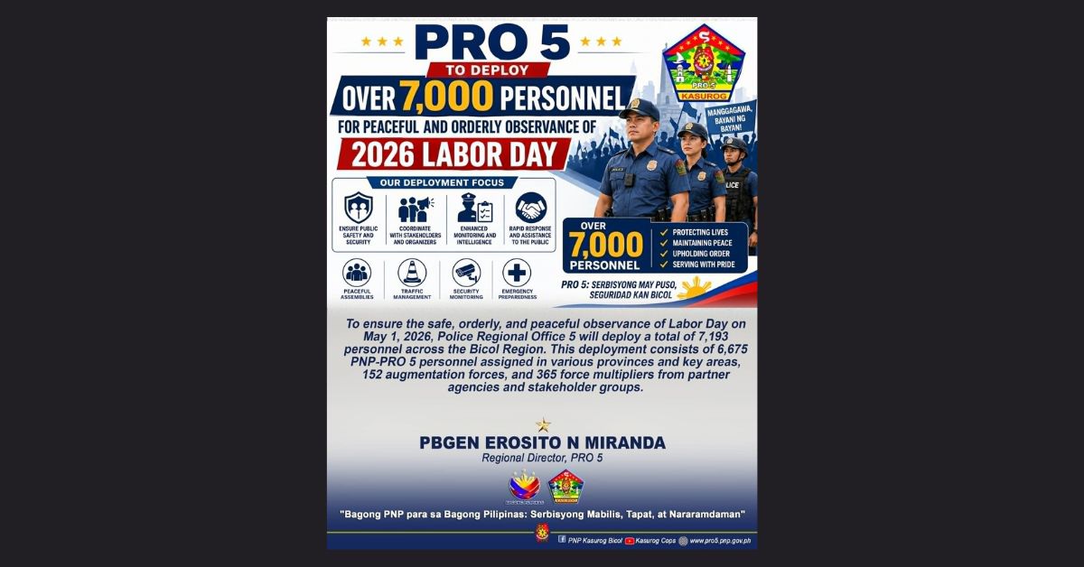 To ensure the safe, orderly, and peaceful observance of Labor Day on May 1, 2026, Police Regional Office 5 (PRO 5) will deploy a total of 7,193 personnel across the Bicol Region.