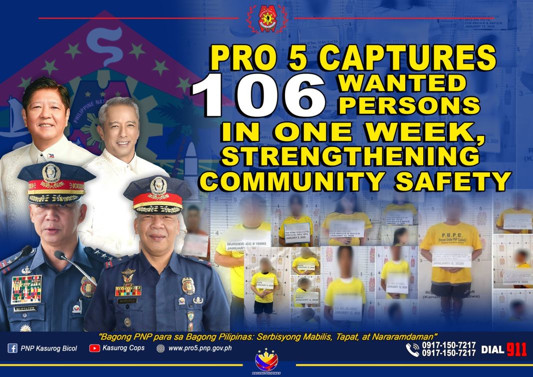 In a focused and decisive law enforcement campaign from January 12 to 18, 2026, the PRO 5 headed by PBGEN Erosito N Miranda, Acting Regional Director, captured a total of 106 wanted persons, reaffirming its unwavering commitment to public safety, peace, and order across the region.