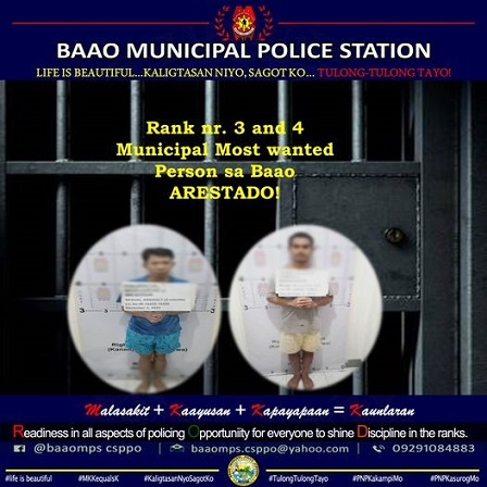 Sa mas pinakusog na kampanya kan Baao Municipal Police Station contra sa mga taong pinaghahanap kan leyes, naging matrayumpo an isinagibong pag-aresto sa duwang lalaki na may kasong rape asin sexual assault.