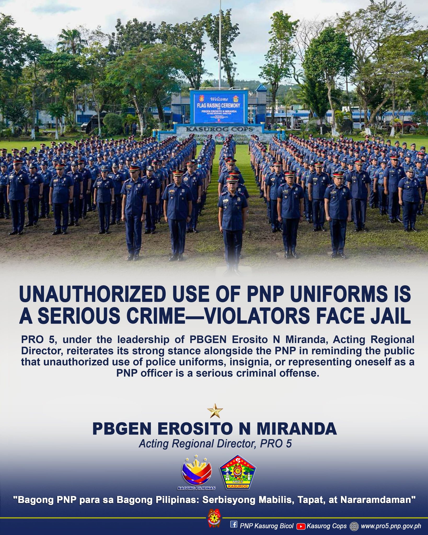 PRO 5, under the leadership of PBGEN Erosito N Miranda, Acting Regional Director, reiterates its strong stance alongside the PNP in reminding the public that unauthorized use of police uniforms, insignia, or representing oneself as a PNP officer is a serious criminal offense.