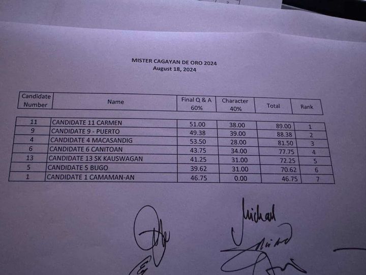 Mahinumdoman, nga nakita sa score sheet sa judge nga gihatagan og zero nga score alang sa character ang kandidato sa Brgy. Camaman-an.