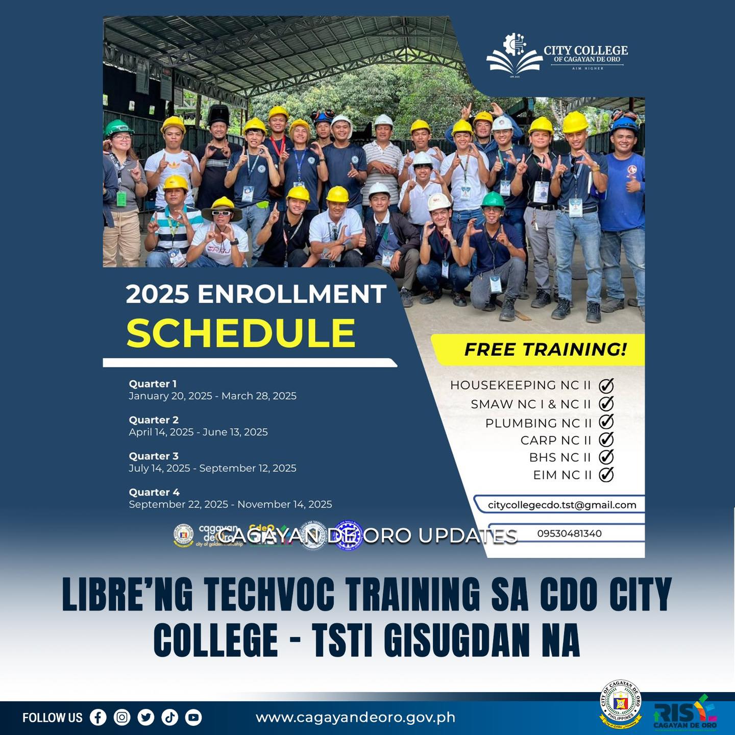 GISUGDAN na sa CDO City College – Technical Skills and Technology Institute (CDO City College TSTI) ang pagdawat og mga buot motungha og libreng technical-vocational skills alang sa 1st Quarter sa tuig 2025.