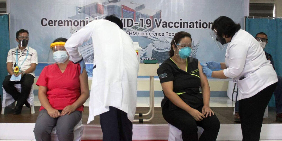 At the RMC, six medical frontliners and one corporate officer received the vaccine shots. Simultaneously inoculated, the first vaccinees were Dr. Jose Pepito Malapitan, acting assistant medical director and Dr. Evram Corral, chair of the Department of Internal Medicine.