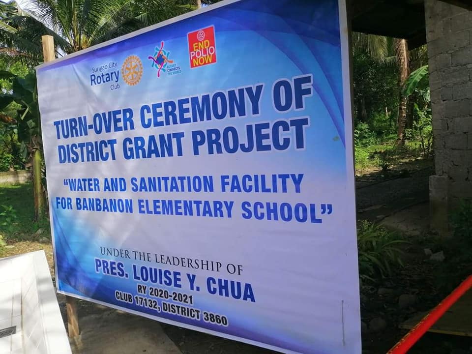 The Rotary Club of Surigao City led by President Ricardo Ragas and Immediate Past President Louise Chua turned over the other day the hand washing facility to the club’s adopted Banbanon Elementary School in Brgy. Banbanon, San Francisco, Surigao del Norte.