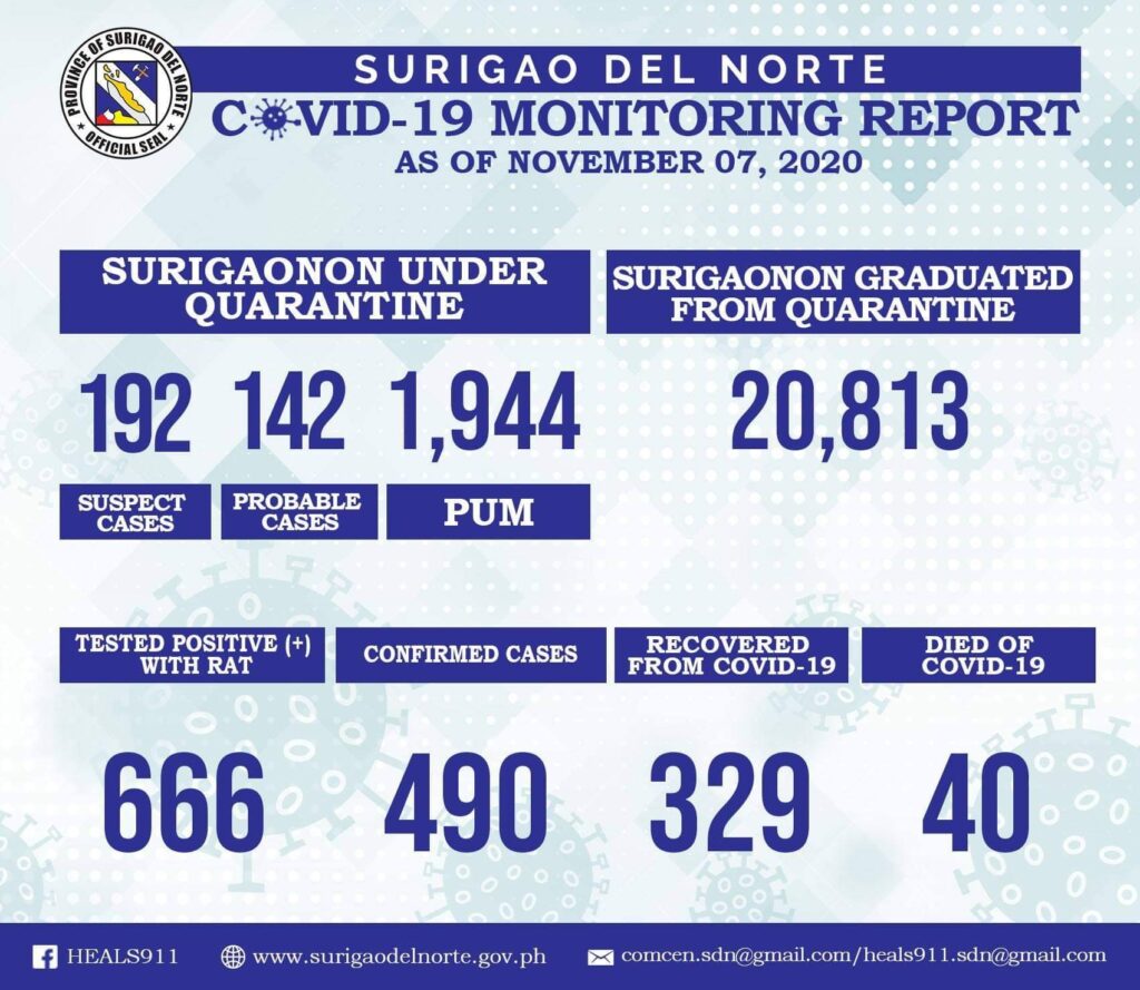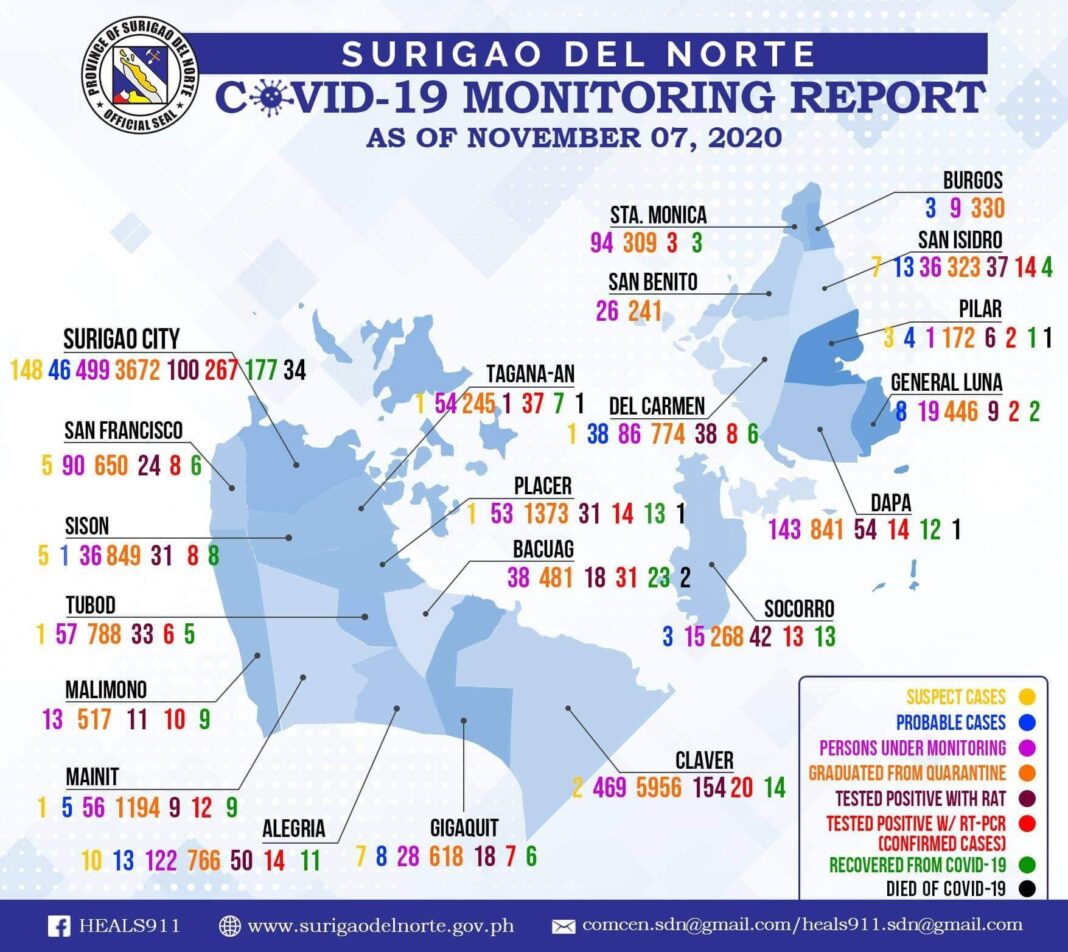 DXKS Surigao NewsProvincial NewsSurigao Del Norte’s COVID-19 Active Cases As Of November 07, 2020By RPN - November 9, 2020042FacebookXWhatsAppViberLinkedinTelegramReddItLINE Surigao del Norte’s Covid-19 active cases as of November 07, 2020.(Source: HEALS 911 Facebook page)Share this: Share on Facebook (Opens in new window) Facebook Share on X (Opens in new window) X