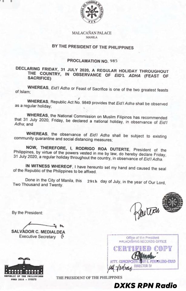 Wayay Trabaho Ug Opisina SilomBy RPN - July 30, 2020027FacebookXWhatsAppViberLinkedinTelegramReddItLINE (PUBLIC ADVISORY) Presidential Proclamation No. 985 (s. 2020), Declaring Friday, 31 July 2020, a regular holiday throughout the country, in observance of Eid’l Adha (Feast of Sacrifice).#WalangPasok Share this: Share on Facebook (Opens in new window) Facebook Share on X (Opens in new window) X