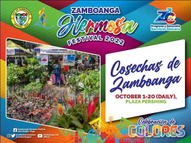 Ya organisa con el mencionao actividad el City Agriculturists Office donde parte tambien este del Zamboanga Hermosa Festival este venedero mes de Oktubre. Cosechas de Zamboanga o quesellyama ‘Harvest of Zamboanga’ ta man display maga siyembra ornamental, maga flores,cactus,frutas,gulay,maga delicasiya y maga agri-products. El Cosechas de Zamboanga hay abre na venedero Oktubre 1,2022 na Plaza Pershing en este ciudad. (Cristine Falcasantos) (Photo Courtesy of City Government of Zamboanga Page)